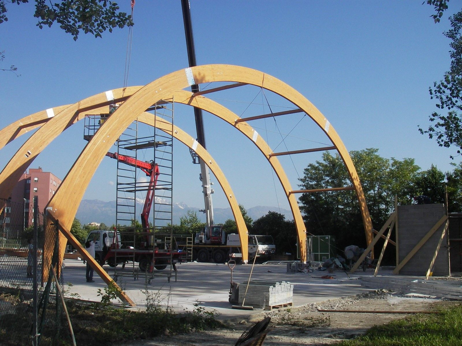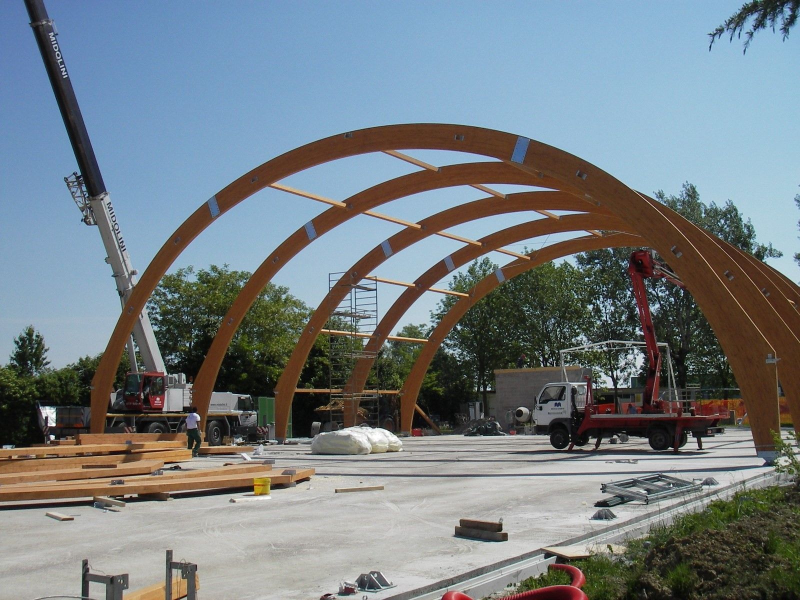 Questa nuova costruzione a Pordenone è la prima struttura nel Pordenonese a essere interamente realizzata con travi lamellari in legno centinati a incastro reticolare.