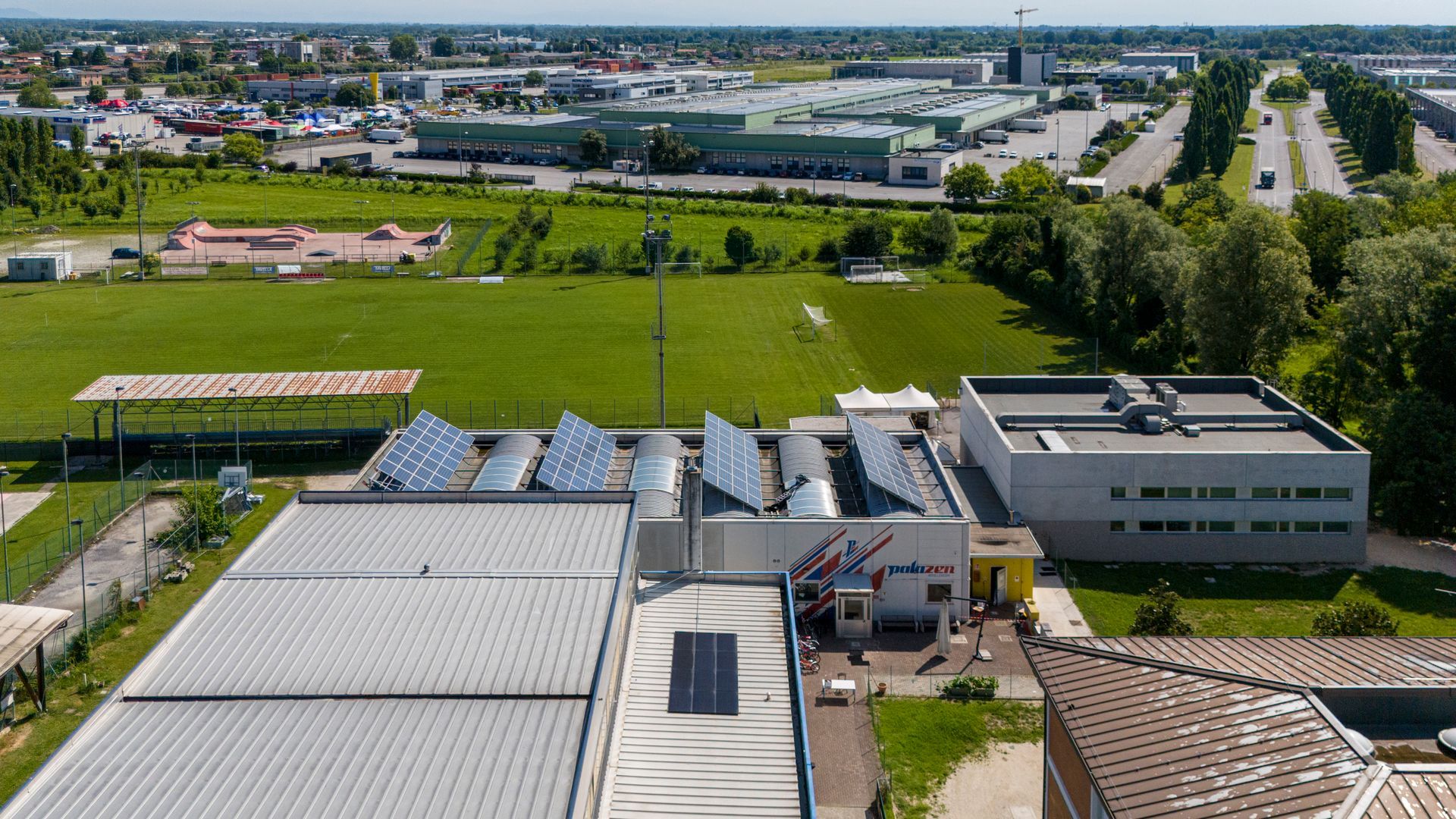 Palazzetto dello sport di nuova costruzione a Pordenone dedicato al judo, in struttura prefabbricata modulare con elementi portanti in calcestruzzo, integrato con moduli fotovoltaici per la produzione di energia pulita.